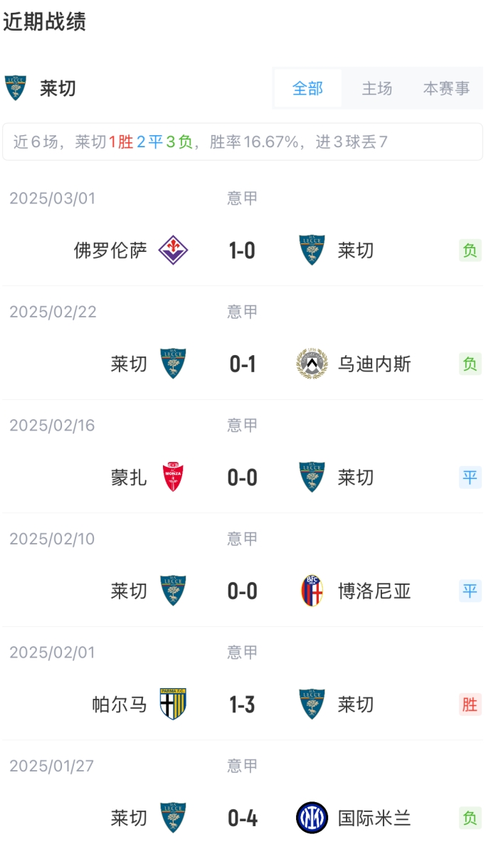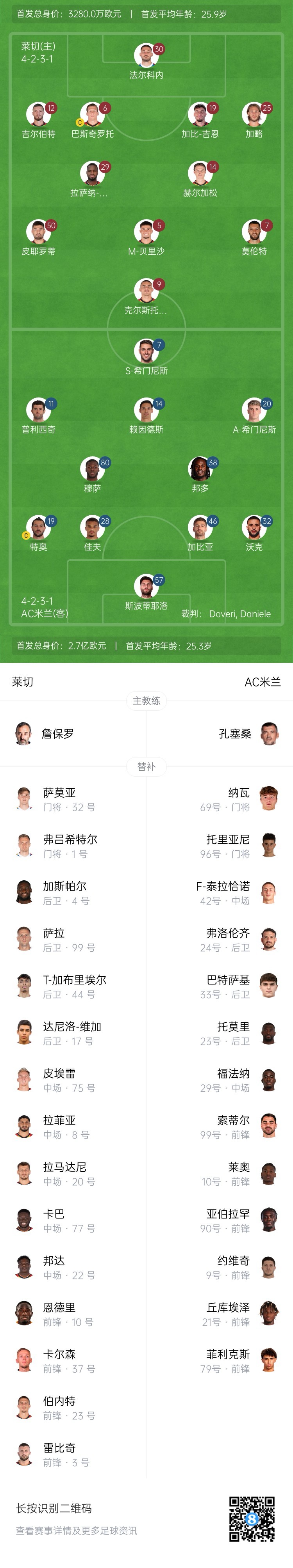 莱切首发:30-法尔科内、12-吉尔伯特、6-巴斯奇罗托、19-加比-吉恩、25-加略、29-L-库利巴利、14-赫尔加松、50-皮耶罗蒂、5-贝里沙、7-莫伦特、9-克尔斯托维奇